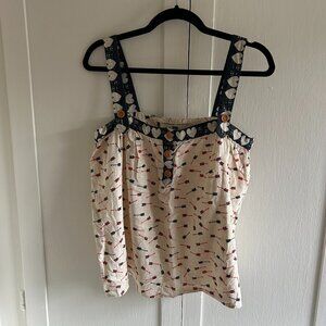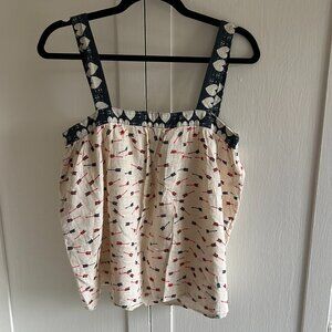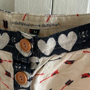 Oh Built By Wendy- fave of all the 2010 indie girls!! This fabulous, lightweight blouse features adjustable straps, button-front closure at neck and breezy fit, all in an iconic Built By Wendy blue and red hearts and arrows prints. In great used condition- no rips or stains. Sz M.