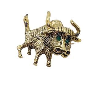 Vintage Bull Brooch Pin Gold Tone Green Eyes Signed E Costume Jewelry Figurine