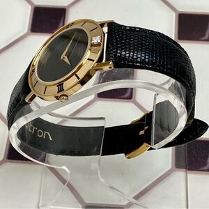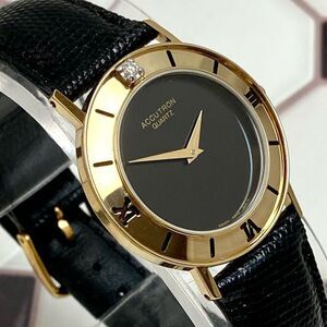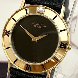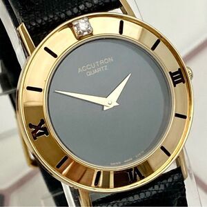 Vintage 1999 Swiss made Bulova Accutron "Time n' Ice" quartz watch with diamond accented bezel. Issued as a man's watch, it is small by today's standards. Please ensure case size works for you before purchasing. Watch features a gold-tone case (most likely gold-plated but not marked) with Roman numeral indices at 3, 6, and 9 o'clock and a decent sized diamond at 12 o'clock on the bezel. The black dial is marked, "Accutron Quartz" and "Swiss Made 92576" at bottom edge. Case back is marked, "Bulova Quartz, T9, Base Metal Bezel, Stainless Steel Back, Water Resistant." Case measures approx. 32.6mm across excluding crown, and watch with original genuine lizard strap measures approx. 9" (max wrist size of approx. 7"). Watch is in near mint condition with a scratch-free crystal and minimal wear to case (some light scratches near case back edge). Watch has a new battery and keeping time. Just a stunning vintage Accutron quartz! Would make a great birth year watch for someone born in 1999. Thank you for checking out my closet!
