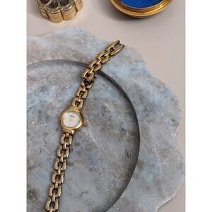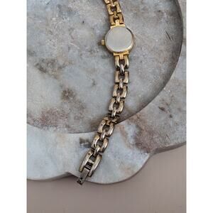 Vintage Bulova Dainty Small Mother of Pearl Face Gold Tone Watch 6.5in Working