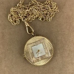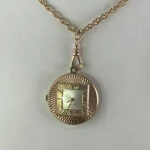 Vintage Bulova Pendant Watch 1 1/4 inch tall Square Face on Round Bezel with Beautiful Brocading pattern on Front and Reverse Mechanical Hand Wind