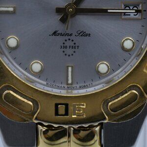 Vintage Bulova Marine Star 90B57T with movement made in West Germany. It was originally water resisitant up to 330 Feet or 100 m. Case size is 36 mm and will fit up to 8" wrist and does not come with any extra links. This dual tone watch has an 11 mm band. It shows normal wear for a watch this old including some of the black on the bezel numbers having been worn off as pictured. The crystal is in excellent condition and the dial looks great. I have not seen another model like this with the 330 ft capability. Because of the West German movement, it dates to the 80's. Please refer to pictures for additional condition details. Let me know if you have any questions.