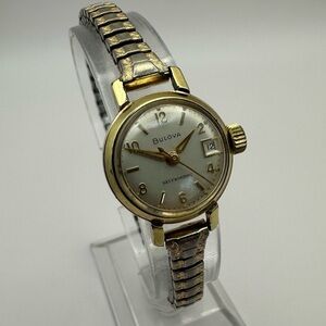 Elegant vintage Bulova automatic (self-winding) women’s watch with a classic round dial and date window at 3 o’clock. The bracelet is a two-tone expansion style that’s easy to slip on and comfortable for daily wear.