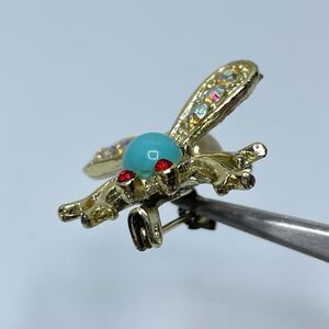 Vintage Bumblebee Mini Brooch Pin Aqua Cabochon Rhinestone 1" Estate Gold Tone