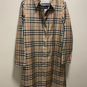 Stylish Burberry trench with double-breasted design. Features classic tan color and button details. Ideal for versatile wear.