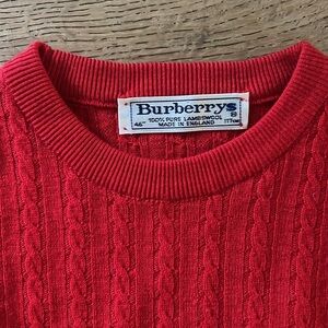 Vintage Burberry Made in England 100% Pure Wool Cableknit Crewneck Cardigan Red