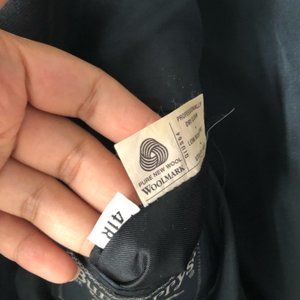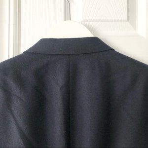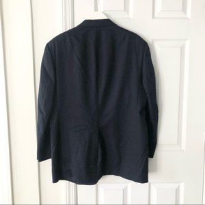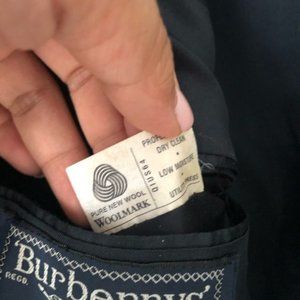 Size 41R from Burberry. Vintage label "Burberry's". Navy blue wool two button blazer jacket with branded logo buttons and sleeve cuff buttons. Interior chest pocket and two exterior waist pockets with flaps. Preowned in good condition with no stains or tears.