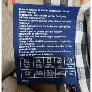 Features: Belt with leather buckle, inner/outer pockets, single breasted button closure, button neck closure, belted cuffs and button vent.