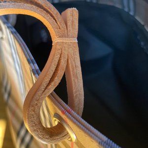 This Burberry plaid tote with natural leather handles is a vintage piece. It is small to medium and measures 14" x 8" x 4-1/2' with a handle drop of 6-1/2". The handle grommets are light gold and the straps are artisan stitched. Tote bottom and edges are in very good condition and handles have a few age spots (see photos). This is a true tote, open at the top. Tags Burberry London and Made in Italy. Durable black lining.
