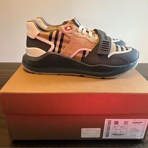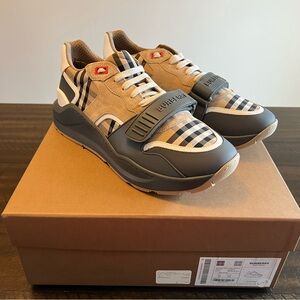 These are a pair of Discontinued Vintage Burberry Ramsey Sneaker in Grey/Archive Beige Checkerboard Pattern Size 44 EU. I purchased these sneakers 8/1/2020 From The Burberry Store On 57th st In Manhattan. I added them to my collection and never happen to wear them. Made in Italy with suede upper, leather lining, and rubber outsole. Features Burberry logo theme, lace-up closure, and comfortable leather insole. Suitable for casual occasions in all seasons. Brand: Burberry London New In Box. Receipt in photos.