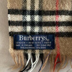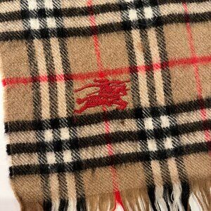 Vintage Burberry scarf in classic tan, black, white and red check.
