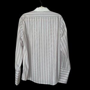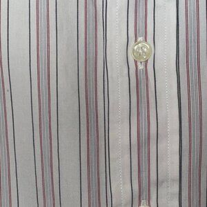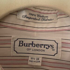 Crafted from premium cotton, this Burberrys White/Red/Navy striped shirt with contrast collar offers sophistication and timeless style. Ideal for professional settings or refined casual wear. Sized at 16.5/38 and made of 100% cotton. This shirt has French cuffs. • Button-down front closure • Single chest pocket • Adjustable buttoned French cuffs • Imported fabric, made in the USA • Classic pointed collar Top To Bottom = 30 Inches Pit To Pit = 24 Inches Sleeve Length = 26 Inches **PLEASE NOTE THAT MEASUREMENTS ARE TAKEN WITH ITEM LYING FLAT AND ARE APPROXIMATES. PLEASE REFER TO MANUFACTURER'S SITE FOR SPECIFIC SIZING INFORMATION** **PLEASE REFER TO ALL PHOTOS FOR OVERALL CONDITION, STYLE, COLORS AND MEASURMENTS** Features: • French cuff, Classic button down Size: Mens 16.5 Condition: Pre-Owned Good Very good pre-owned condition
