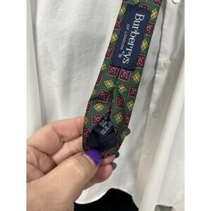 The product is a vintage Burberrys of London tie made of silk in a geometric print featuring green, red, and gold colors. The tie is designed with an abstract theme and is of classic length (60”) and width (3.5”). This tie is a stylish accessory for men, adding a touch of sophistication to any outfit with its unique pattern and high-quality silk material.