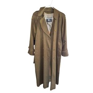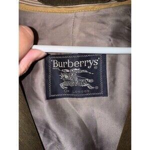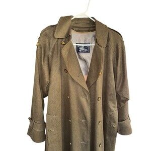 Please see photos. Selling as is. This is a rare find! And beautiful. There is a small tear inside that has been seen and a small tear under left armpit that has not been sewn. Both are not noticeable when wearing. This vintage Burberry's of London trench coat is a rare find in a stylish green color. Made of polyester outer shell material with a wool lining, this double-breasted coat features a classic solid pattern and button closure. The coat is designed with a canvas fabric type, accented with buttons and the Burberry logo. With a size 14 fit, this coat is perfect for the 80s and 90s style enthusiast looking for a timeless and iconic piece to add to their wardrobe. Ideal for winter, fall, and spring, this trench coat is both fashionable and practical for everyday wear.