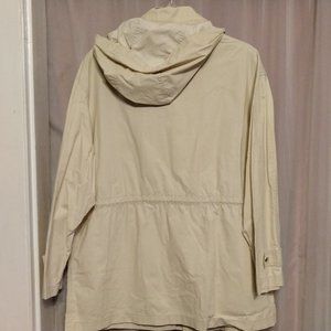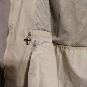 Good pre-worn condition. There is a very small hole in the lower left of the back (see pics). Some wear to the paint on the zipper pulls. Lightweight. Zip front with snap at the top. Chest pockets with diagonal zippers. Lower pockets have flaps with a snap. Tab with snap on cuffs. Hood buttons on/off and has a cord on the ends that can be pulled to tighten. Interior has toggles at the waist. Mesh lining above the waistline.