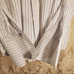 This is such an elegant shirt, for an elegant man. 100% cotton imported fabric white dress shirt with grey and medium blue pinstriping. Spread collar with stitched slots for removable collar stays (not included). The buttons have a mother of pearl finish and are cross stitched. The beautiful french cuffs have a buttoning sleeve placket. It appears to be a classic fit cut shirt with plenty of room for comfort & ease.