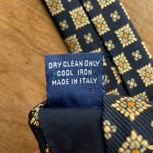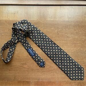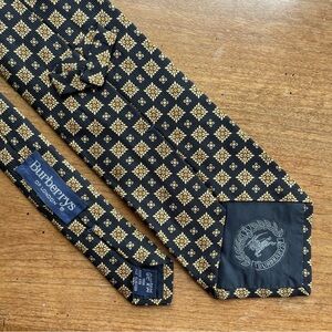 Vintage Burberrys of London Silk Black and Gold Medallion Patterned Men's Tie. Elevate your style with this elegant classic silk tie with geometric medallion print. Features a cute little Equestrian Knight Design knight on horseback carrying a shield and a lance on the front for a subtle logo flex. Nice vintage condition with a pull in the fabric as shown with the pencil tip. The pattern keeps it from being very obvious.
