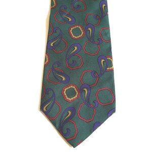 Burberrys of London men's necktie in forest green with purple paisley and reg and gold toned octagons.