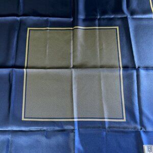 Elegant and timeless, this vintage Burberrys of London scarf features a sophisticated navy and gold geometric border with a subtle micro-pattern center. Crafted in Italy from 100% pure silk, it showcases the brand’s classic heritage and impeccable craftsmanship.