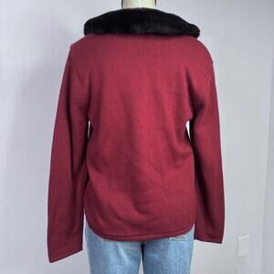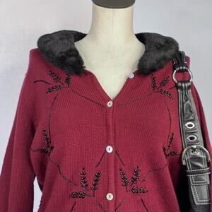 Vintage Burgundy Embroidered Cardigan Sweater Faux Fur Collar Beaded Medium Pet