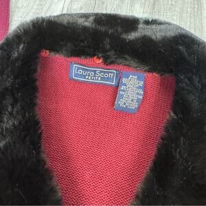 Vintage Burgundy Embroidered Cardigan Sweater Faux Fur Collar Beaded Medium Petite , Good Condition