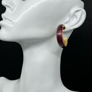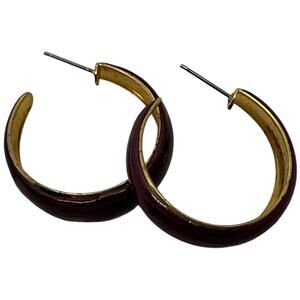 These vintage earrings feature a bold, burgundy-colored enamel hoop design with a gold-tone metal post back. Measuring approximately 1" x 1" in size, these retro-inspired hoops are suitable for pierced ears and are in good overall condition.