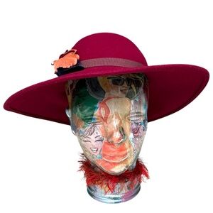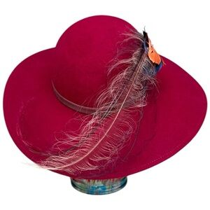 vintage feather hat, wide brim felt hat, doeskin wool hat, burgundy vintage hat, fall fashion hat, real feather hat, Kurt Jr. hat, 1970s wool hat, dramatic brim hat, statement hat, Tom Horn designer, show hat, red wool hat, collectible hats, retro wool felt