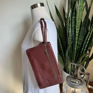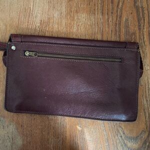 Genuine leather wristlet clutch in a rich burgundy tone with classic stitching, a back zip pocket, and soft suede interior. Timeless vintage style made in Brazil.