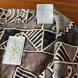 Burma Bibas Men's size M 100% silk shirt in geometric indigenous island pattern, beautiful brown/gray/cream colors. Button-down, short-sleeve, finished hemline. Excellent condition with no stains or defects. Machine washable.