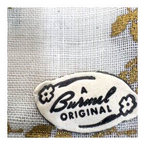 Elevate your vintage accessory collection with this exquisite Burmel handkerchief. Delicately crafted with intricate blue and gold botanical designs, this piece transforms from a simple fabric square to a statement of refined elegance. Its pristine condition and original packaging make it a must-have for discerning collectors and vintage fashion enthusiasts.