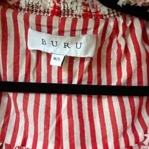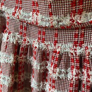 Adorable and unique car/ driving jacket! 3/4 length sleeve, 2 snap collar, red black white plaid stitching, lining white and red stripes.