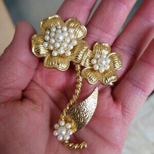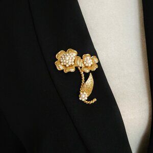 Double flower brooch with faux pearl clusters, textured gold tone petals and leaves, and a twisted stem brought to you by Butler and Wilson.