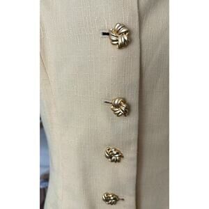This vintage butter yellow blazer serves serious 80s/90s runway energy—Chanel-inspired with a cottagecore twist. Features a sculptural scalloped hem that mimics a blooming flower, luxe gold-toned buttons, padded shoulders, and princess seams for a tailored, feminine fit. Made from a soft polyester-rayon blend. Size 14.