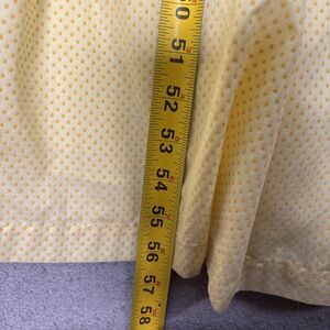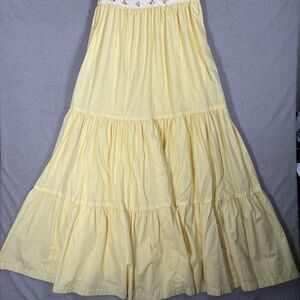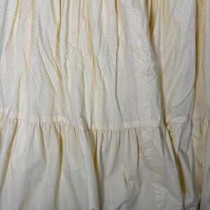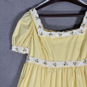 This is a charming vintage-inspired maxi dress in pastel yellow with delicate polka dots. It features puff sleeves, a square neckline, and beautiful white lace trim with embroidered yellow flower accents. The empire waist and tiered full skirt give it a flowy prairie-style silhouette. Perfect for cottagecore, boho, or romantic retro-inspired outfits, summer picnics, or even Bridgerton or Regencycore looks. Bust (pit to pit): 17.5" (~35") Waist: 18" (~36") Hips: 23" (~46") There is no size tag and I estimate the dress would fit as a medium, but check measurements or reach out with any questions. Please refer to the photos for more information on the condition of the items. Item color may vary slightly from pictures. Check measurement photos to ensure a perfect fit. Some images are generated with AI, clothing on models may differ slightly. Photos with no models are the genuine item. We offer FREE shipping on any orders of 2 or more items. Orders are processed and shipped in one business day, ensuring you receive your items promptly. We use USPS Ground Advantage shipping. If you require any changes to the shipping type please contact us BEFORE purchasing and we can help with adjustments.