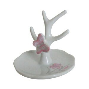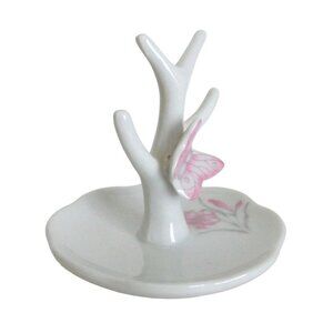 This elegant porcelain jewelry ring dish holder features a delicate butterfly perched on a branch, perfect for displaying rings, earrings, and small accessories. The subtle floral design on the dish adds a touch of sophistication, making it an exquisite addition to any vanity or dresser.