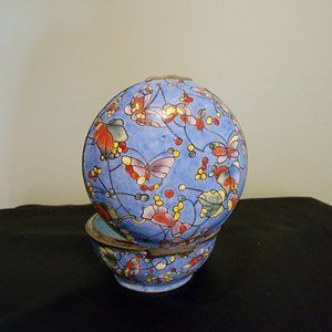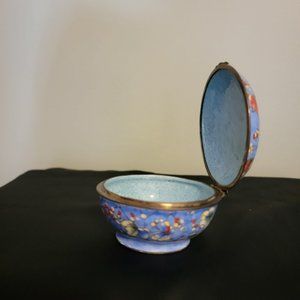 Vintage painted enamel trinket box with butterfly design. Hinged lid. Made in China, unknown maker. Widest diameter approx. 2 1/4". Bottom of base approx. 1 1/2". Approx. 7/8" deep. Azure blue background with multi-colored butterflies and leaves/berries, all connected with fine dark lines on lid and outside of base. Delicate free flowing pattern. Interior of trinket box is a lighter blue. Item has been in a display case for decades. Smoke free home.