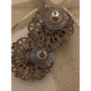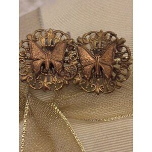 Made in warm gold-tone metal, each earring features a raised butterfly set against a lacy, round filigree background. The intricate scrollwork gives them that romantic Victorian revival vibe, while the butterfly adds a playful boho twist.