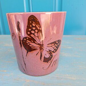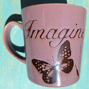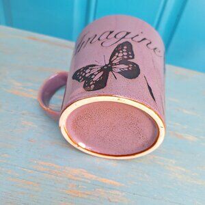 Butterfly Mug Purple Imagine Vintage Pfaltzgraff Mugs Discontinued Coffee Cup Butterfly Decor Gift. Its purple! Can look pink in some lighting but its purple. The color may look different depending upon the light and colors so it is shown in both sunlight and shade in the photos. Gorgeous Muted Purple or lavendar color with espresso color that is almost black. Multiple Butterflies with the word Imagine has shiny glazed finish is easy to clean. Lovely cute gift idea. Said to be discontinued vintage Pfaltzgraff.