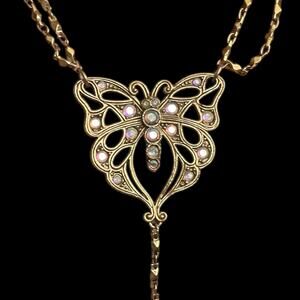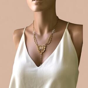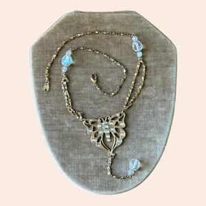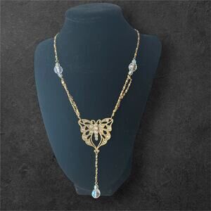 Vintage Butterfly Necklace Y Drop Gold Tone AB Rhinestone Signed Avon