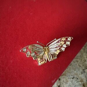 This vintage butterfly brooch pin is a beautiful addition to any jewelry collection. The intricate wire filigree design in silver and gold adds a touch of Bohemian elegance to any outfit. The brooch is 2 inches wide and features a delicate gypsy design that is perfect for those who love unique and vintage items. The brand and country of origin are unknown, making this brooch a mystery that will surely capture the attention of collectors. The main stone is not present, making it a great choice for those who prefer simple and timeless pieces.