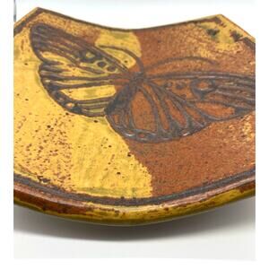 Vintage Butterfly signed Studio Pottery Gold Burnt orange footed dish signed