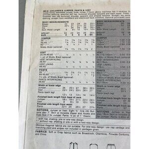 Includes instructions and 14 pieces for creating a child's jumper, pants & vest. Previously used with signs of handling; pattern pieces have been cut. Vintage condition.