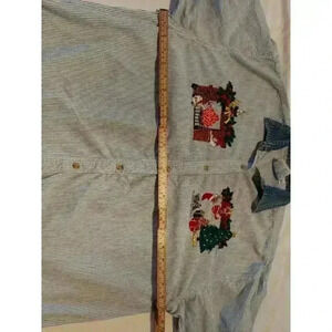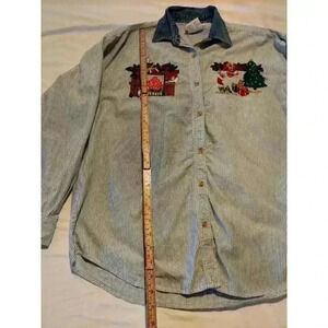 Get into the holiday spirit with this vintage button-down blouse from Westport. Featuring a blue striped pattern with embroidered accents, this blouse is perfect for any Christmas occasion. The long sleeves and collared neckline add a touch of sophistication.