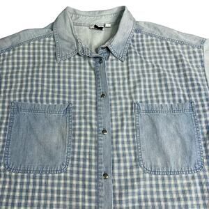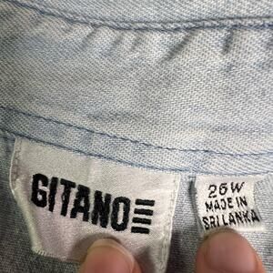Vintage Button Front Blue Gingham Plaid Pin Stripe Long Sleeve Shirt Gitano Tag Size 26W Approximately a 3X, Good Condition