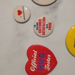 Explore a unique collection of vintage buttons featuring various designs and slogans. Perfect for collectors and enthusiasts.