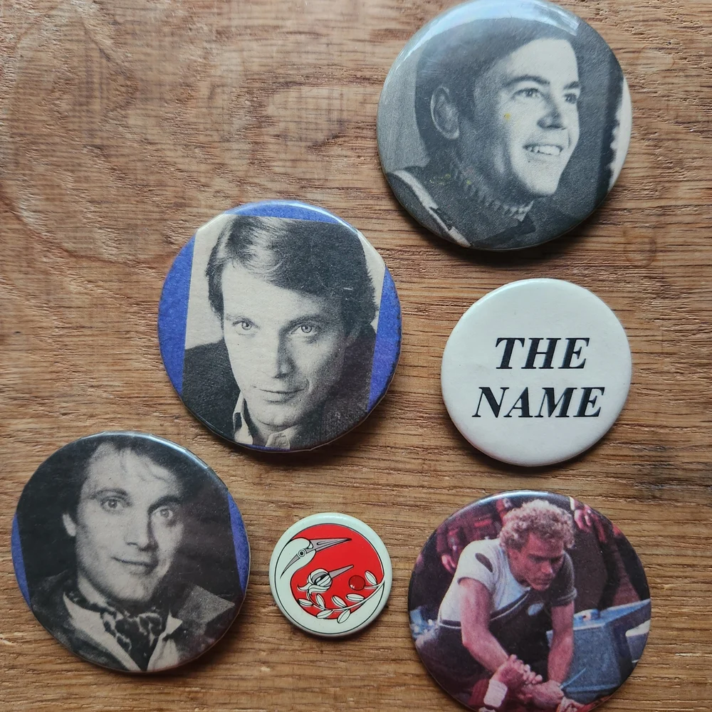 Set of vintage button pins featuring black and white portraits and text. Unique collectible items.