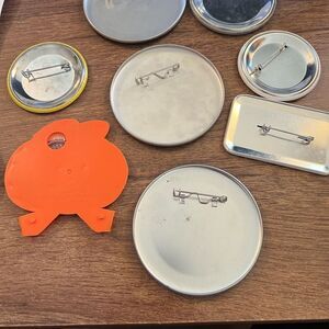A collection of vintage button pins featuring various designs and logos. Includes colorful graphics and text.