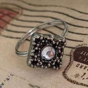 Vintage button ring with rhinestone wire wrapped silver tone. In good used condition. Size is 8+. SOLD AS IS
