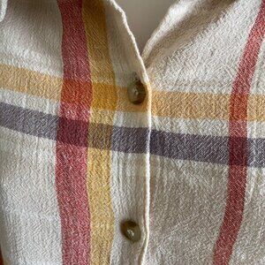 Classic vintage Button Up Plaid Blouse from The Avenue, perfect for women size 14. Lightweight and made from cotton, this short sleeve shirt in white, red, and yellow offers timeless style and comfort.
