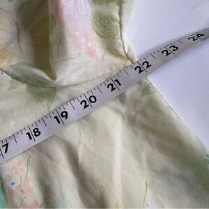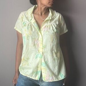 Vintage button up pajama top. No size or material tag. Per measurements, would fit up to a modern size large. Feels like cotton or at least a blend. Yellow with multicolored butterfly print. Peter Pan collar with dainty lace detailing. Great condition. No flaws to note.